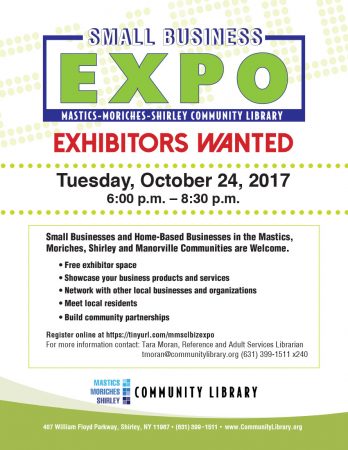 Showcase your local business to residents and connect with other businesses in the Mastics, Moriches, and Shirley area at the Community Library’s Business Expo! Each business gets a table to display their products and promotional materials. Sales are NOT permitted at the Expo. The Expo is free to businesses and the public. To register, please go to: https://tinyurl.com/mmsclbizexpo