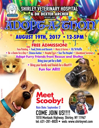 Please come join us for our annual Adopt-a-Thon and family fun day. Adopt a furry friend from the rescues and shelters that will be joining us today. We will have music and games, food, drinks, and dessert and raffles. Bring your kids to play doctor for a day, you can also bring your pet for a bath. We will also be holding hospital tours and educational seminars about the services we offer here at Shirley Veterinary Hospital.